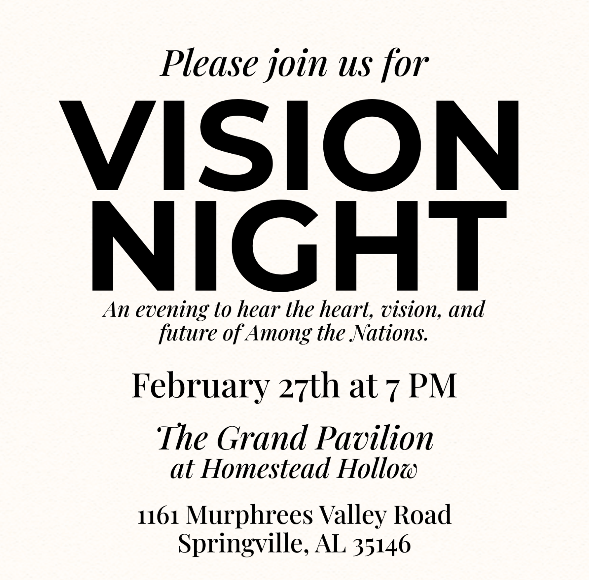 Vision Night is a space for us to steward and communicate the mission of Among The Nations with clarity and faithfulness, sharing what God has entrusted to this ministry and where He is leading us next. This evening is about bringing people together around the mission, cultivating meaningful partnerships, and inviting others to participate in the work of seeing every nation follow Jesus through the power of the local church.